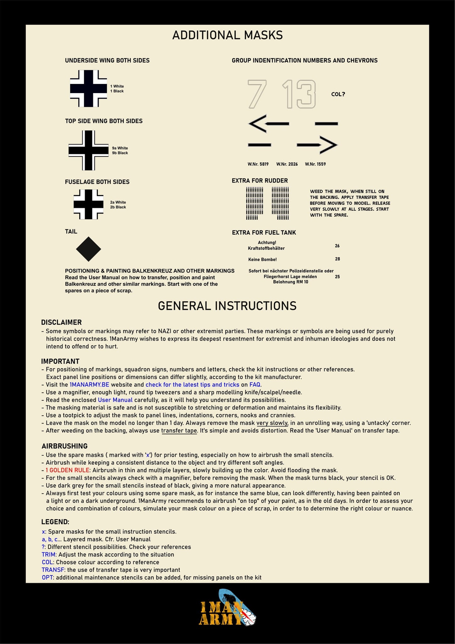 The 1ManArmy innovative high-definition paint masks offer a seamless way to airbrush markings, numbers, and even the smallest instruction stencils on scale models. Masks provide a natural, "painted-on" look without the challenges of traditional decals and associated carrier film.