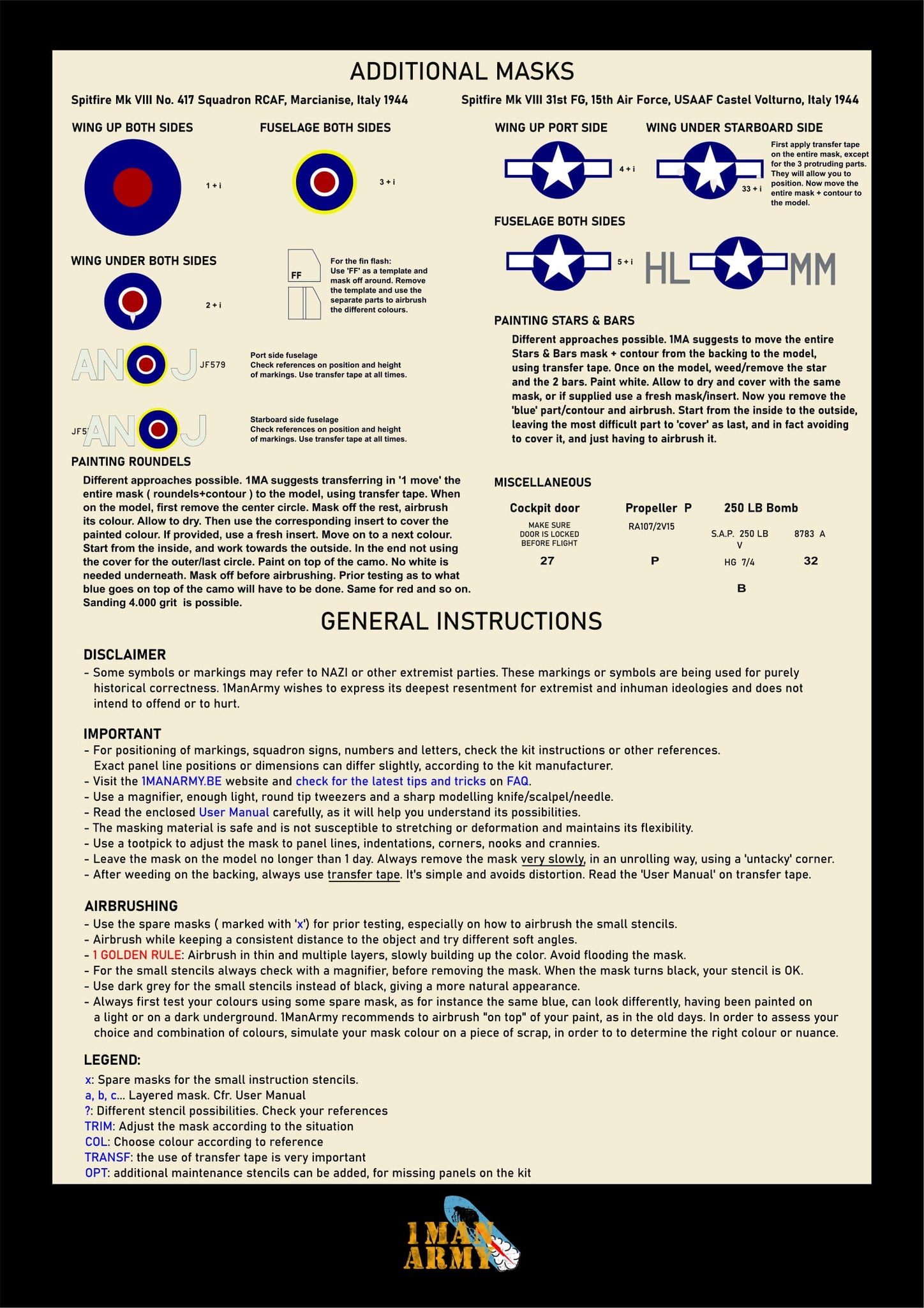 Experience flawless detailing with 1ManArmy’s high-definition paint masks, designed to effortlessly airbrush markings, numbers, and even the tiniest instruction stencils on your Tamiya Supermarine Spitfire Mk. VIII scale model.